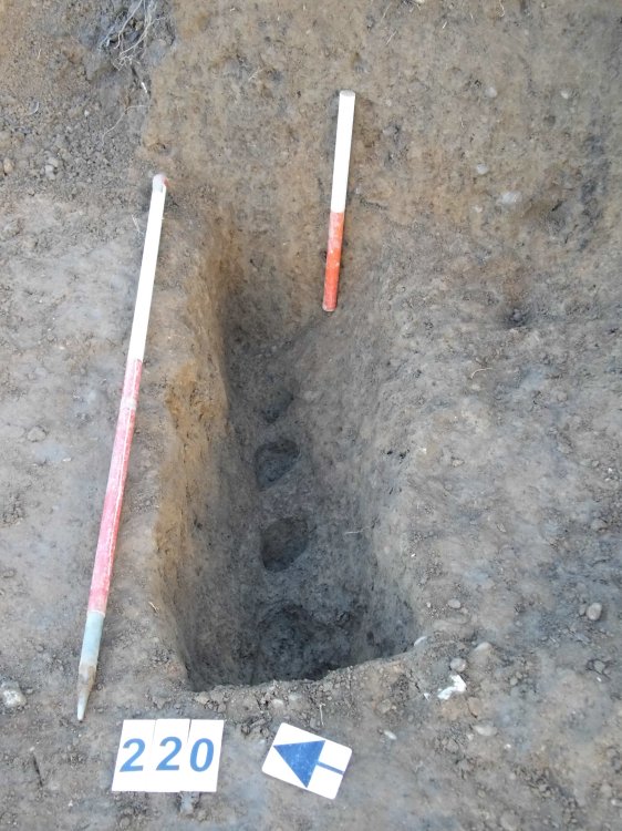 No further archaeology was found in the additional trial trenches and the function of the large sub-rectangular enclosure in the site’s south-eastern corner remains uncertain. Trenches across the earthwork suggest that its banks were not deliberately constructed but rather a natural build-up of soil and it may relate to medieval ploughing as ridge and furrow across this part of the site appears to respect it.