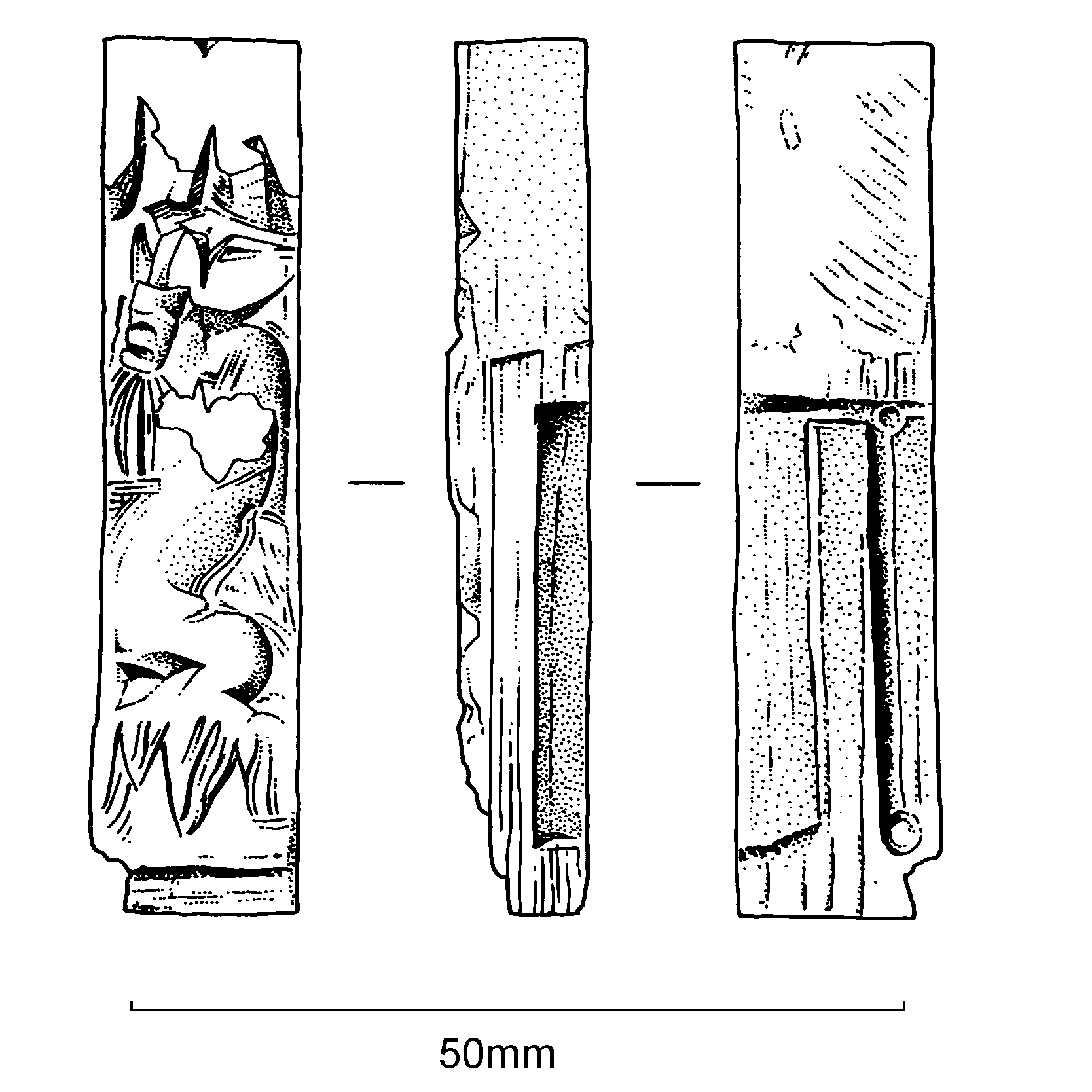 This small, rectangular ivory panel (just 57mm long) was found during the excavation of a large Roman townhouse in Leicester’s north-east quarter (today situated beneath the John Lewis car park on Vaughan Way). It is from a box and it is an extraordinary find. Relief-carved ivory boxes are extremely rare discoveries and this fragment is exceptional because of its design. Unusually, instead of belonging to a classical tradition, it depicts the Egyptian god Anubis squatting amongst lotus flowers and grasping a lance in his right hand.