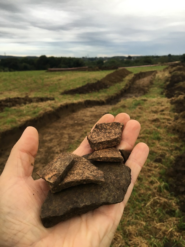 Last Thursday, in thick fog I supervised the digger machining open the three trenches that we will be investigating over the next couple of weeks. This is a tense moment. Before you break ground, you have no idea what you’re going to find or how deep it is going to be. Surprisingly, the archaeology is shallow at Castle Hill, about 30cm below the ground, and very well preserved.