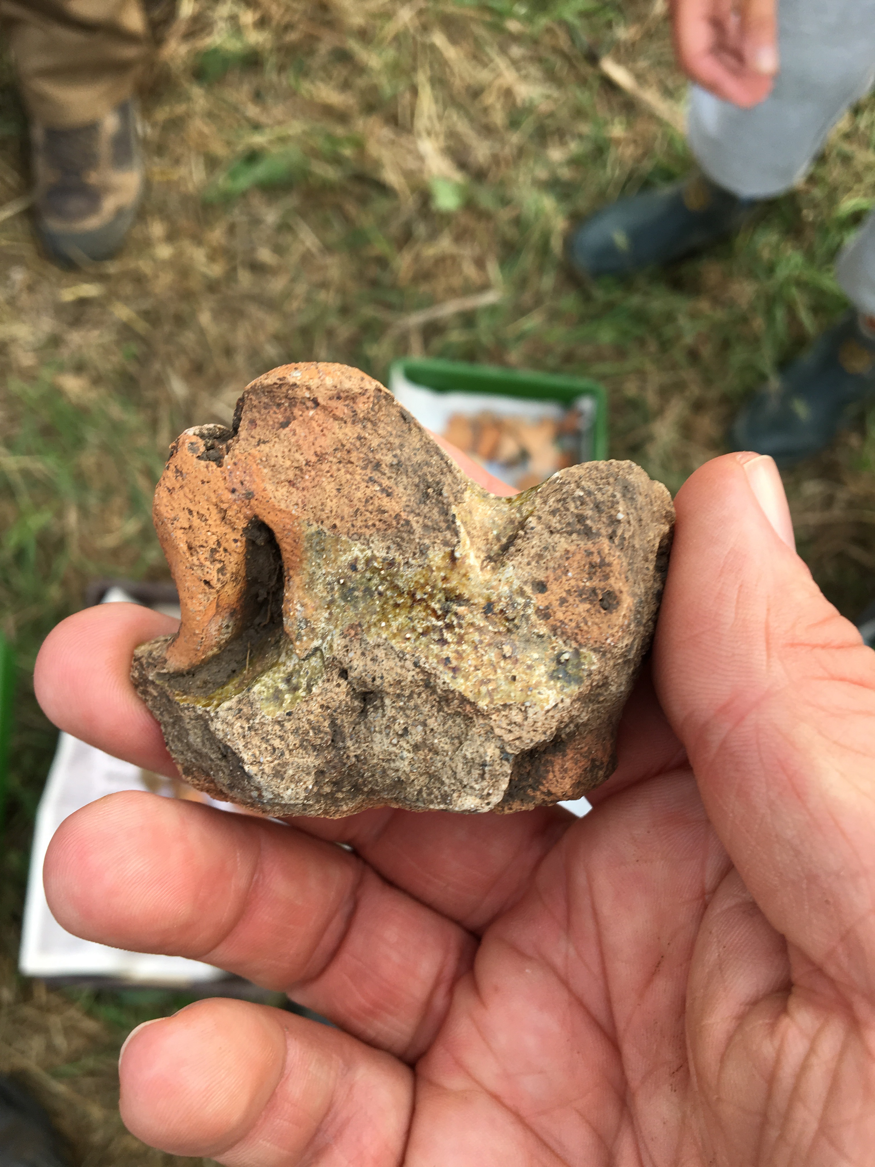 Whilst finds are lacking in Trench 1 at the moment, the opposite is true in Trench 3. The ‘rubble’ layer seen in the geophys has proved to be an extensive layer of broken roof slates (all local Swithland slate) of a type that has probably come from an important medieval building. A large quantity of green glazed medieval pottery has also been found as well as fragments of glazed ridge-tiles, including a fragment of glazed loop-handled decoration (see image). Cursory inspection of the pottery suggests it is predominately 13th and 14th century in date, which fits with the period the Knights Hospitallers held Beaumont (read our first blog).