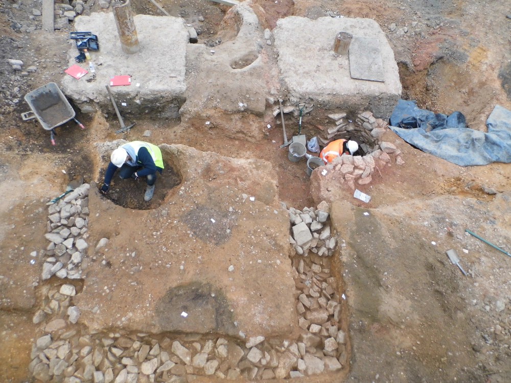Elsewhere on site, a series of smaller roadside Roman structures have been discovered – presumably shops or small houses. One building was rectangular with an apse at one end and contained a grey tessellated pavement with red border. An attached adjacent well was constructed of stone, vast quantities of over-fired tile (including a fused stack of roof tile) and broken pieces of quern stone. The function of the apse building is uncertain, but the team speculate that it could be a temple, or Late Roman church?