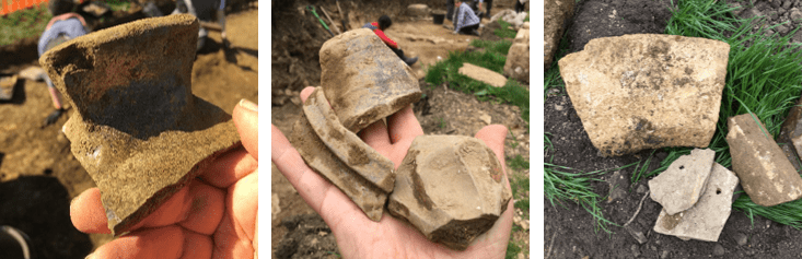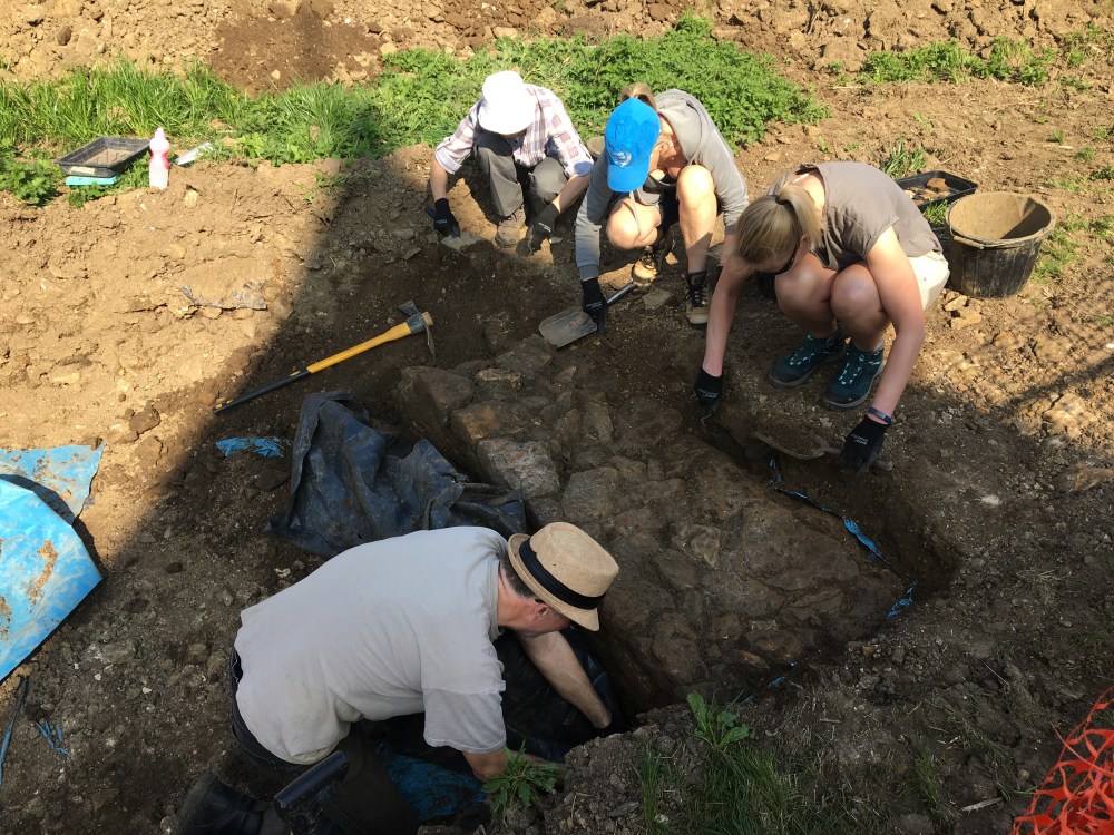 Work in Trench 2 has only just begun but already we have identified that this area of the castle, west of the Hall, is covered in a thick layer of rubble. Some of this has probably fallen from the castle’s curtain wall whilst the rest has come from the demolition of other castle buildings. During the removal of the rubble, we found several pieces of stone tracery, probably from the arch of a medieval door or window. A wall found by Time Team’s wall, at the northern end of our trench, has also been found again and we now have evidence for the opposing wall of the building. Our focus in the second week will be to learn more about this building and look for evidence of earlier buildings beneath it.