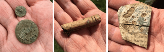 The topsoil is full of finds dating to the late 17th, 18th and 19th centuries – pieces of clay tobacco pipe, pottery, china, animal bone, iron nails, copper buttons, a bone knife handle and part of a jar lid for Crosse & Blackwell Anchovy Paste (c.1839). This ‘rubbish’ was probably dumped here by the people of Oakham after the castle had been abandoned, the site becoming a convenient place to dispose of refuse.