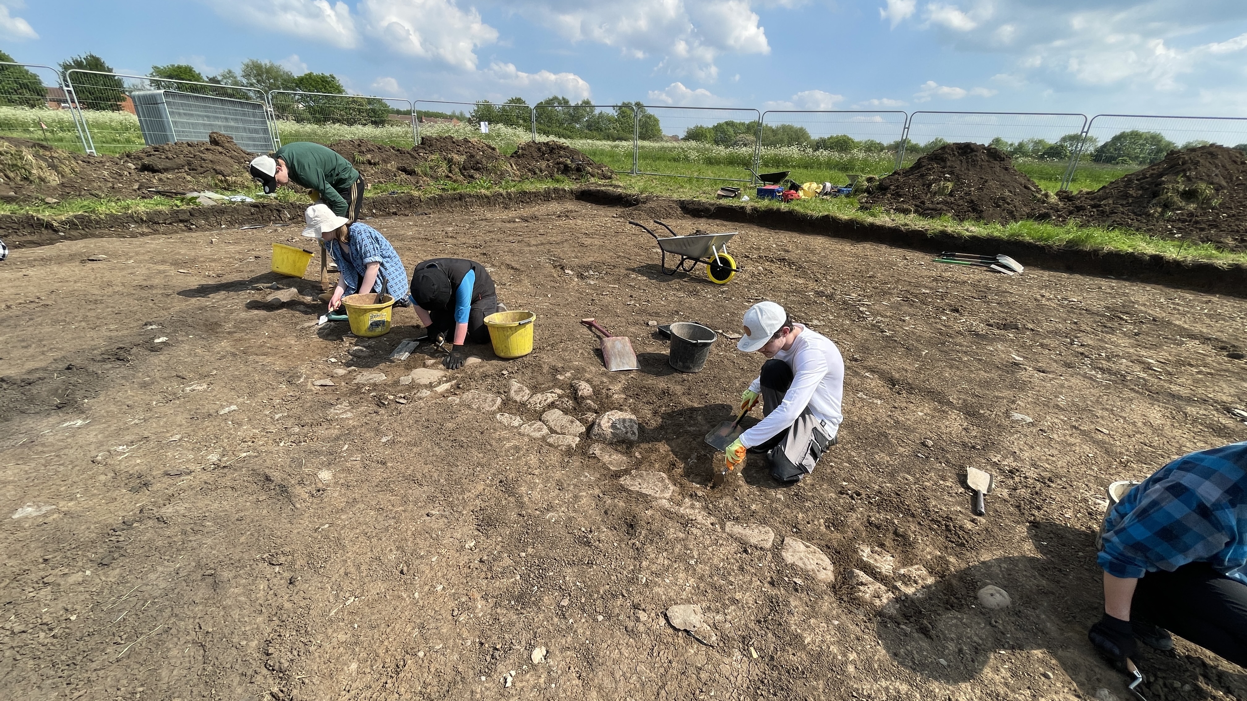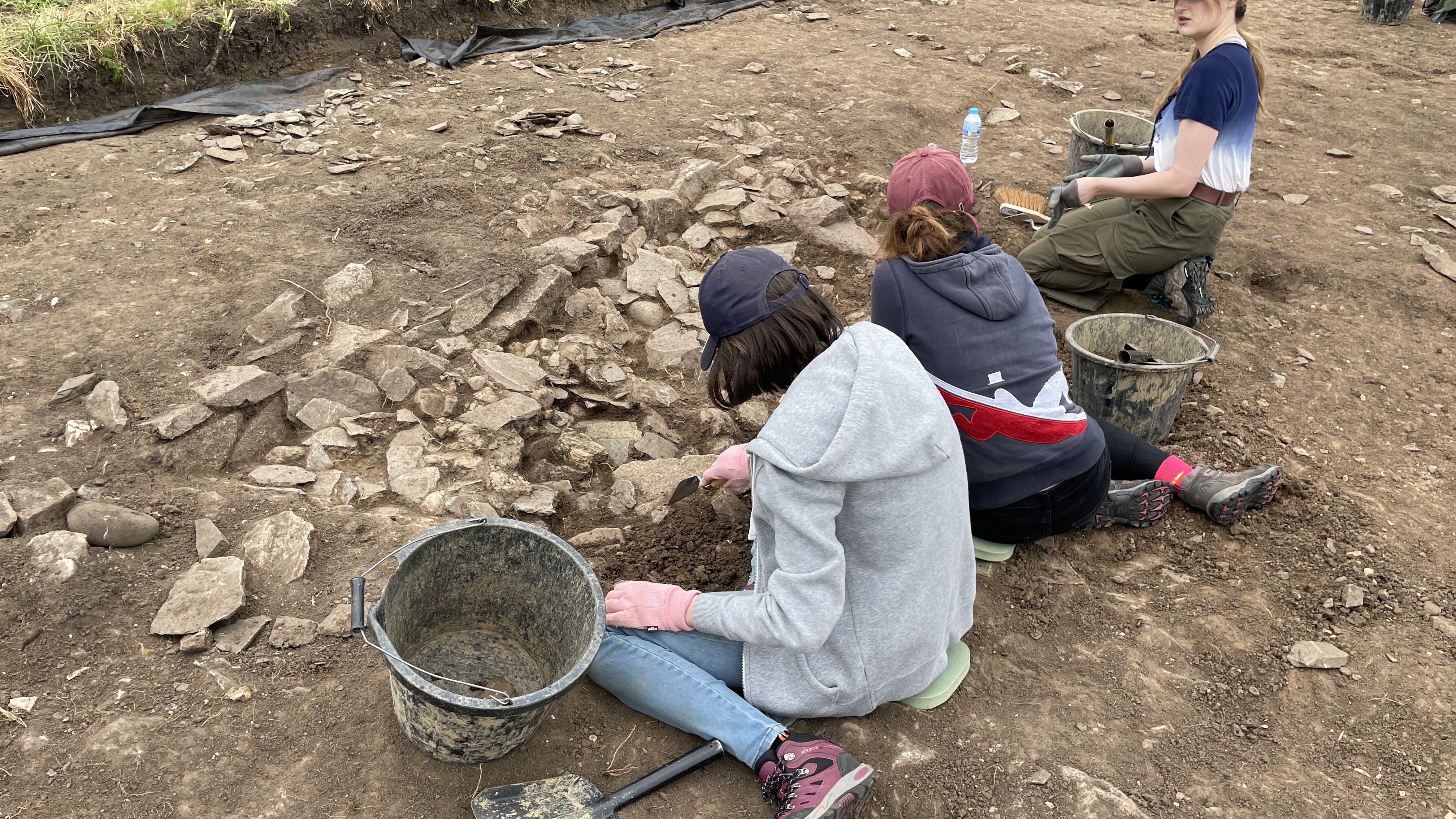 A line of stones, possibly a wall, starts to emerge as the topsoil and subsoil are removed.