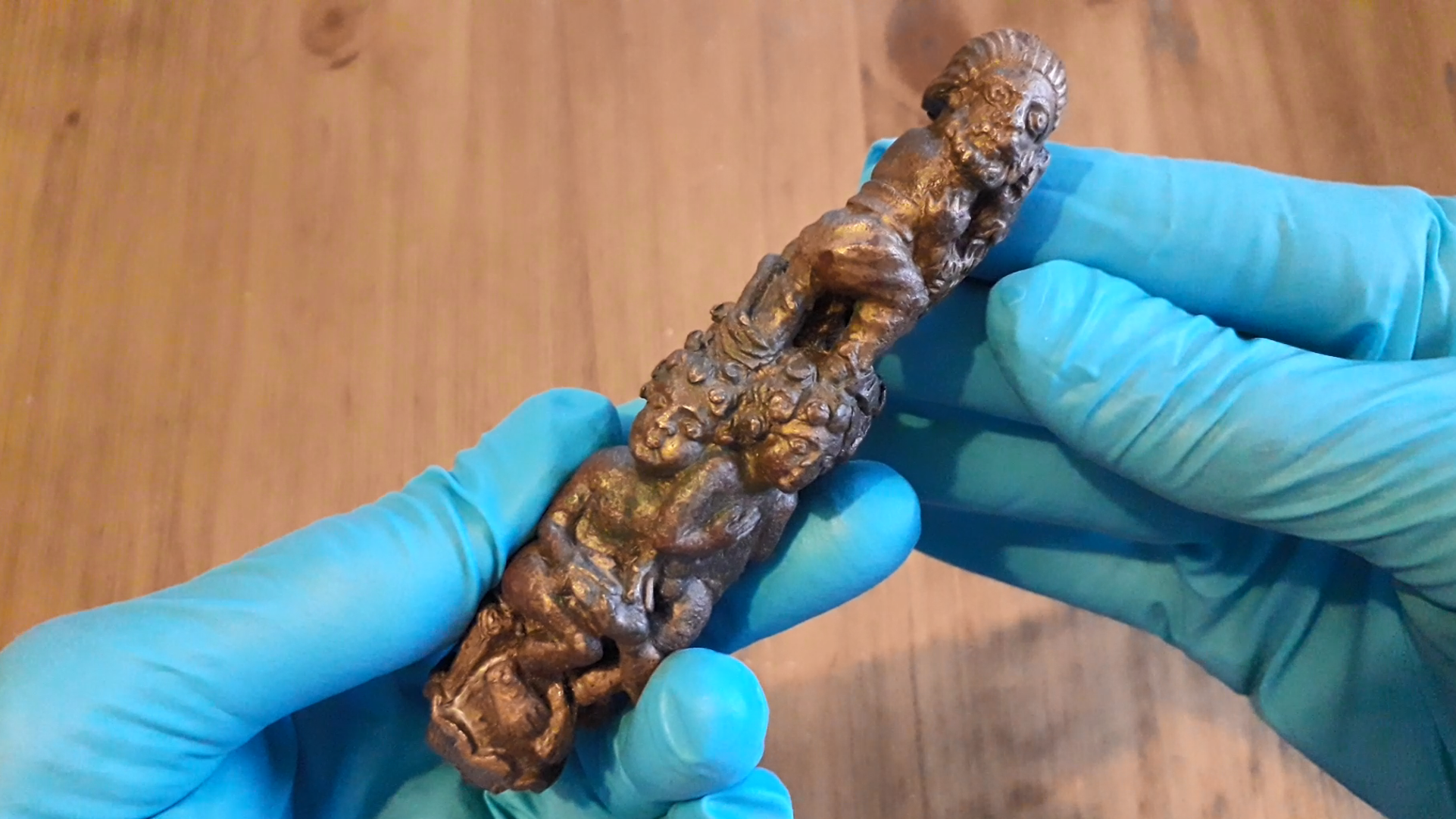 The handle portrays a ‘Barbarian’ grappling with a lion, together with four naked youths cowering in terror. It is among the first evidence from Roman Britain of executing captives by ‘throwing them to the lions’.