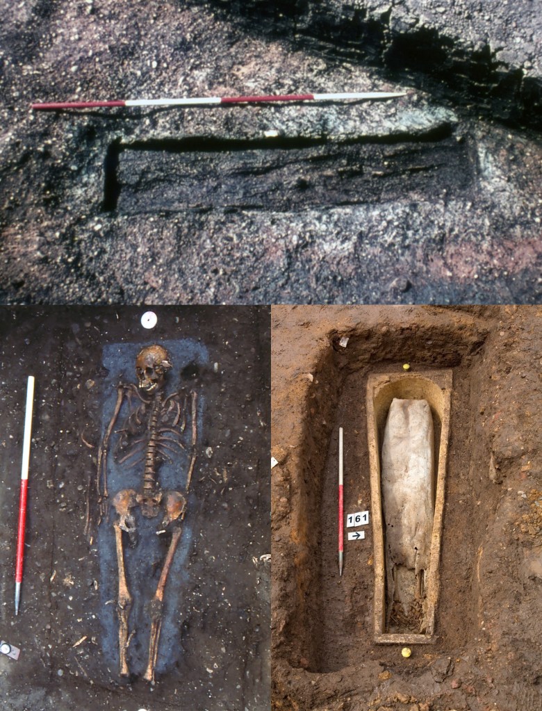 The people of Leicester have been burying their dead in coffins for over 1,800 years. In the town’s Roman cemeteries nearly half of the burials were in wooden coffins and discoveries of lead coffins are described in antiquarian reports. Wooden coffins were also used in the medieval period, although they weren’t as common (none were found during the excavation of St Michael’s church and only 3% of the burials at St Peter’s church were in coffins). Lead coffins and stone sarcophagi were rarely used, although examples have been excavated in the town, most recently at the church of the Grey Friars.