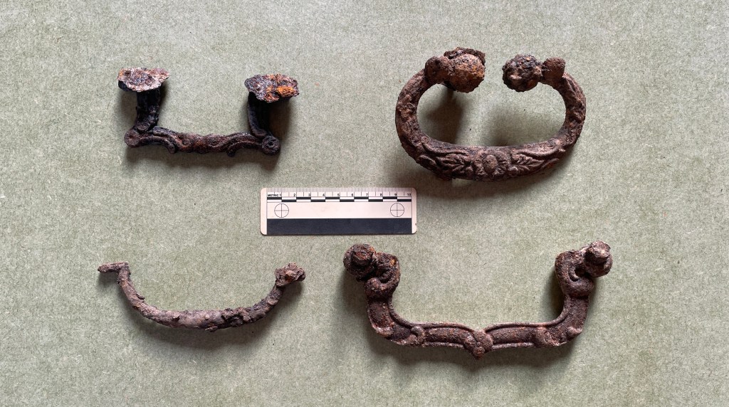 Many of our late 18th and 19th-century burials have coffin furniture like this. Most coffins had a name plate, usually made of iron although we have had two examples in brass. More elaborate coffins were covered with a felt-like fabric fixed down with coffin studs or coffin ‘lace’ (bands of tin-dipped stamped iron in assorted decorative patterns, for outlining the lid, sides, and ends of a coffin). Some were augmented with other lid motifs.