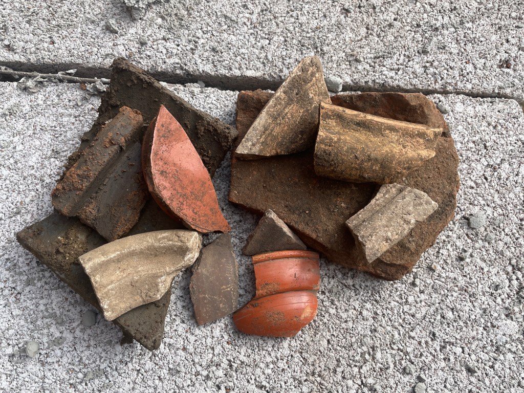 That said, we have also had a few insights into what might be beneath the burials. The dark cemetery soil is looking like it will be 1.5-2.5m thick. Beneath is a paler, sandier soil which has produced some large sherds of Roman pottery and a small quantity of building material, including roof tile and box flue (needed in buildings with hypocausts – Roman underfloor heating). In several places the auger has also hit tightly packed granite rubble about 3.5m below the ground. This might indicate that there are Roman wall footings still in place down there.