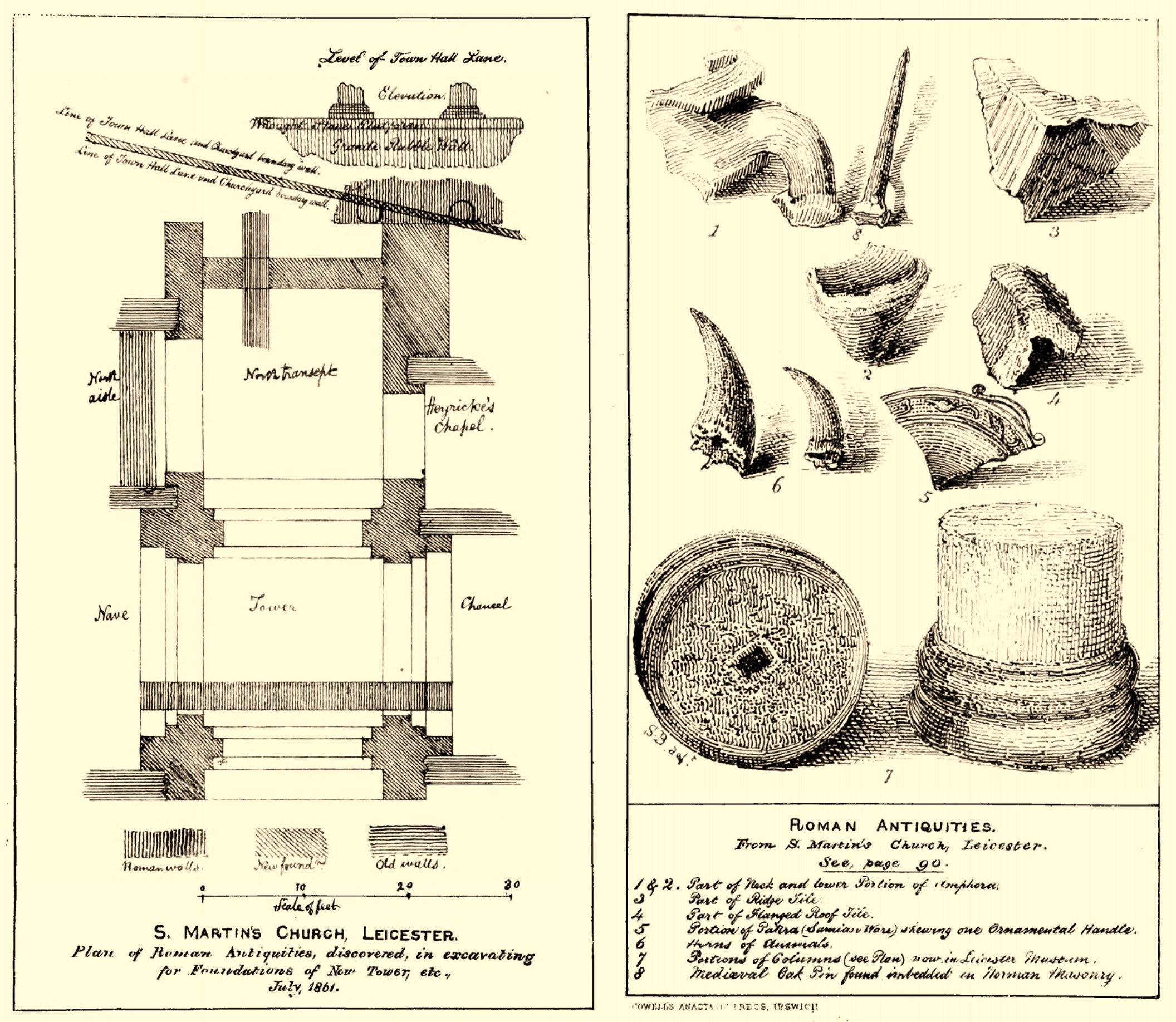 “The excavations at S. Martin’s, Leicester, have brought to light many antiquities of great interest. Several considerable portions of the foundations of ancient walls have been discovered: and, upon removing the earth in July last on the north side of the church close to the palisading dividing the church ground from the Townhall Lane, the workmen came to a rubble wall of considerable thickness, surmounted by a wrought stone platform, upon which stood the bases of two massive Doric columns, each about two feet in diameter. These columns, in all probability, formed a portion of a colonnade, which, judging from their size and the space intervening between about ten feet would be one of considerable length. The earth in the interior also contained numerous fragments of Roman pottery, and the bones of animals and birds. Two coins the one of Nero, the other of Constantine were likewise turned up; the truth of the tradition that a Roman temple stood upon the site of the present church being thus, it is presumed, unequivocably proved.”