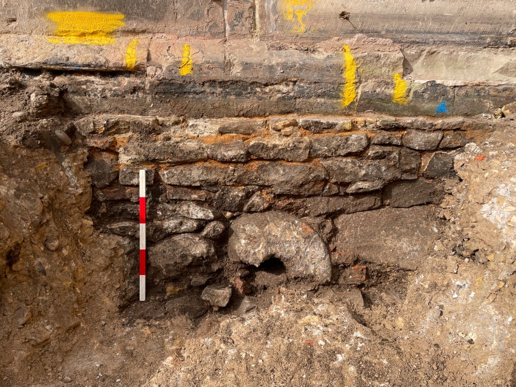 To say that this explicitly proved that there was a Roman temple beneath the Cathedral is a bit of a leap. In truth, the evidence could equally support a colonnade along a shop front, or the peristyle around a courtyard, or any number of other interpretations. This is what makes the new excavation so exciting. Here is a unique opportunity to see what this area of Roman Leicester was like. Other groundwork, including the construction of a new ground beam close to the Cathedral, has revealed something of the original construction of the Cathedral’s Great South Aisle. At the end of the trench for a new ground beam, where the below-ground masonry for the east wall of the south aisle was exposed, a complex story of building and rebuilding was uncovered. You can explored it in this 3D model