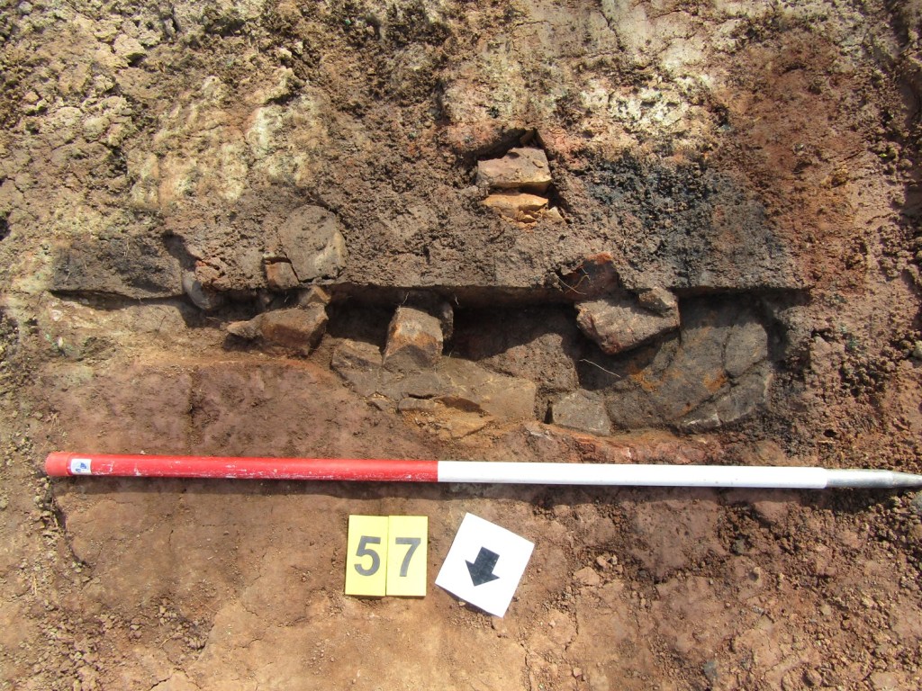 The corn dryer/malting oven on our site, due to its shallow depth below the ground, had not survived well and appeared to have either collapsed or been deliberately demolished during antiquity. As such there were layers of stone tumble both inside and outside the feature masking its true form. However, once the rubble was removed by hand it was clear that it comprised a shallow rectilinear trench with a single surviving course of in situ sandstone blocks around its perimeter. The western extent was damaged by a post-medieval furrow. As such, any evidence of an associated stoking pit, fireplace or flue was lost. Across the base of the feature was a layer of compact, charcoal-rich silt which contained germinated glume wheat bases and detached embryos. The sprouted embryos still attached to the grain could be approximately measured and were all shown to be of the same length, indicating that the germination of these cereal grains was a controlled and deliberate act which re-enforces the likelihood of malting, in this instance, for the brewing of wheat beer. It should be noted that, while beer had a short shelf-life, ground malt could be stored for up to a year and it is possible that the fragments of mortaria and storage jars from the site were not refuse from a nearby settlement, but instead could have been used on site as part of the process of preparing and storing the malt.