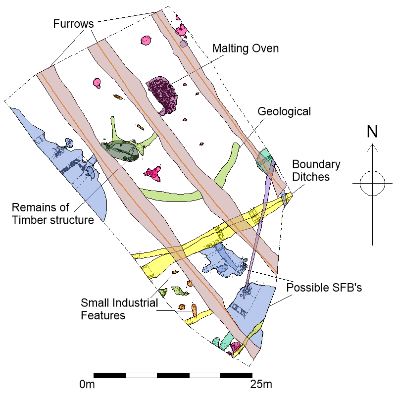 Archaeological remains were predominantly associated with industrial activities and were located in two clusters, one at either end of the site, separated by large boundary ditches running south-west to north-east. The area of stonework found during the evaluation proved to be a large, stone built corn dryer or malting oven, located in the northern extent of the site.