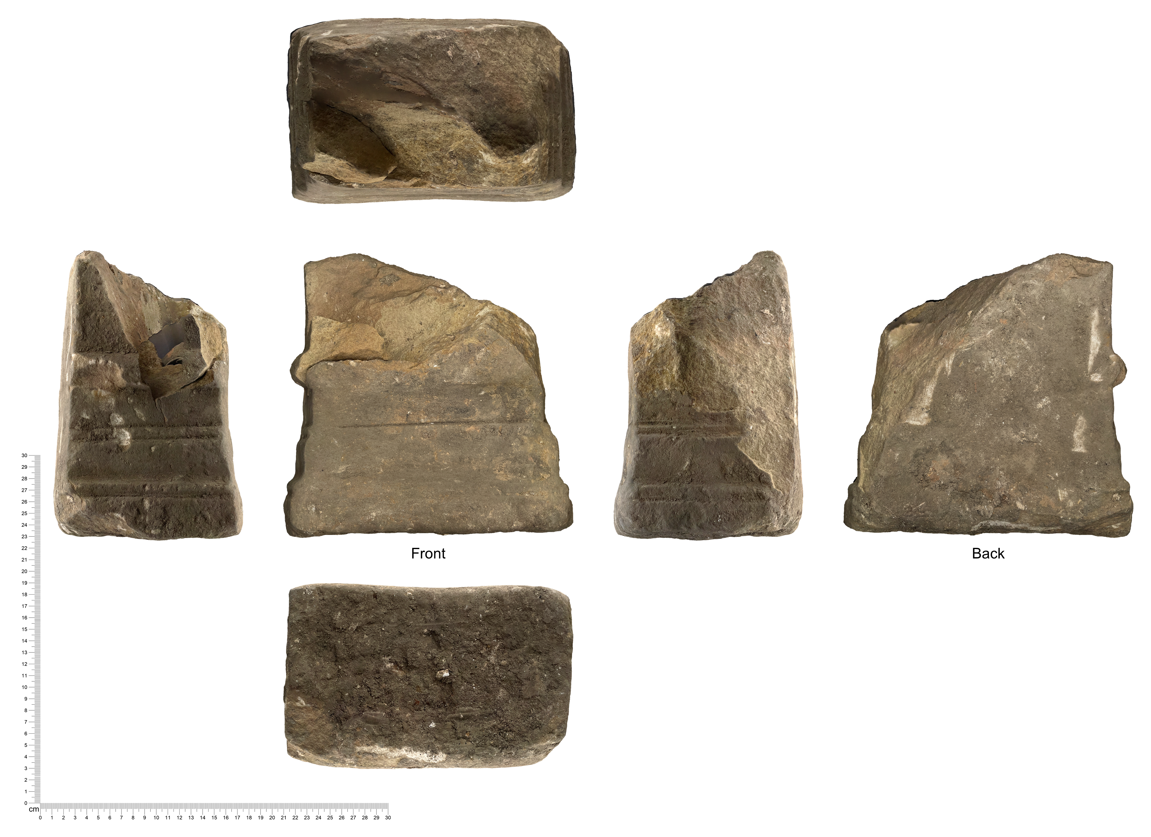 The sunken room was probably built in the 2nd century AD and was accessed in the south-west corner via an external passageway. This had timber walls and a flagstone floor. The cellar was deliberately dismantled and infilled, probably in the late 3rd or 4th century, and within the space, lying broken and face down amidst the rubble, we found the base to an altar stone. It is carved from local Dane Hills sandstone, quarried 1 mile west of the site near Western Park, and measures 25cm by 15cm. There are decorative mouldings on three sides and the back is plain, showing that it would have been placed against a wall. Originally, it would have stood higher than it was wide, perhaps around 60cm tall, but it is broken mid-shaft and the upper part of the pedestal and the capital are missing.