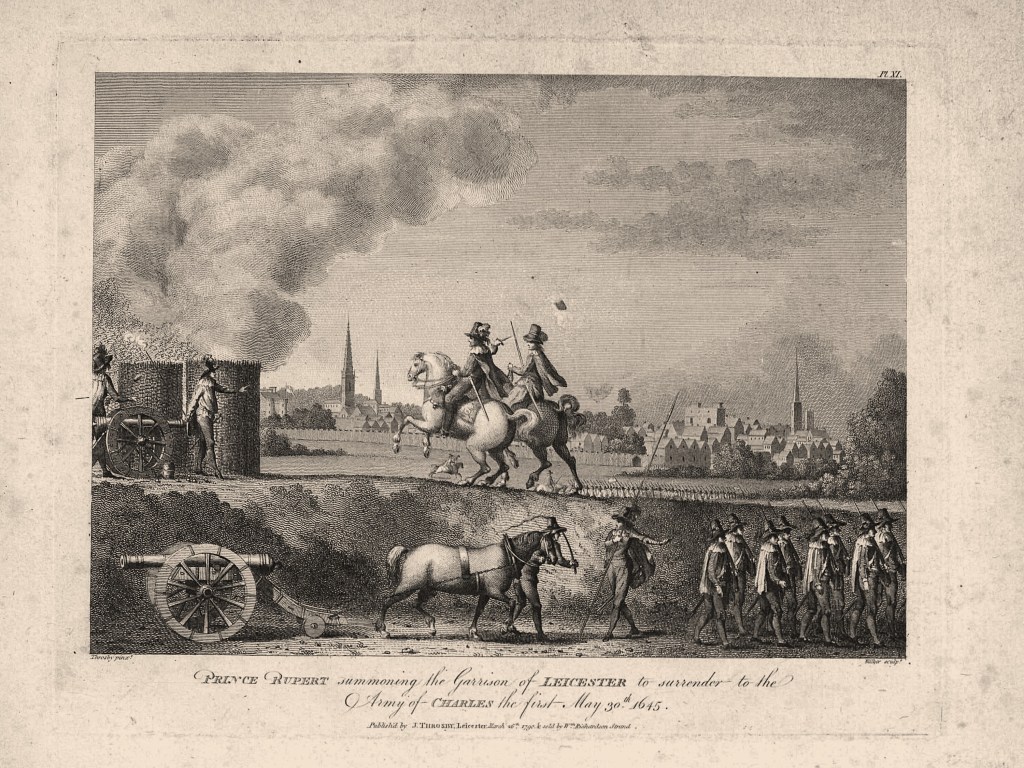 By accident or design, churches were often caught up in the fighting during the English Civil War. Their thick walls, lofty towers and walled graveyards gave them great military potential. At Leicester, St Margaret’s Church and its graveyard were incorporated as a strong point in the town’s outer defensive works. It was also the scene of fierce fighting during the siege and the town’s governor Colonel Theophilus Grey, severely wounded, was captured in its graveyard. At St Mary de Castro too, crude Civil War era musket loops hacked through its medieval boundary wall can still be seen today. Whilst in the town’s north suburb, on Woodgate, St Sunday’s Church perished as a fiery prelude to the attack when the town’s garrison burnt it down to prevent it being occupied by Royalist snipers.