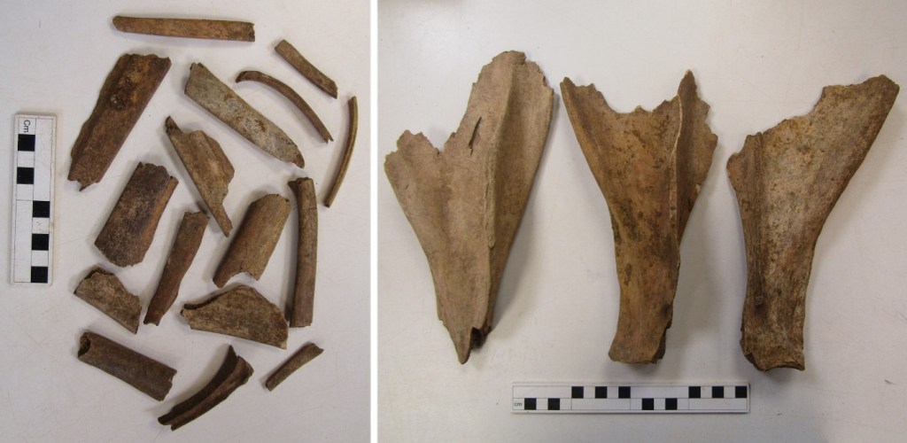 One trend that was evident came in the form of large quantities of highly butchered rib fragments. These had been broken down into short, uniformly sized pieces; a common Roman practice to allow for the stewing of bones within cooking pots. Other groups included largely complete cattle shoulder blades, some of which had damage suggestive of piercing by a hook. These are consistent with the process of suspension for drying or smoking and fine knife marks on these specimens indicate where the cured meat was cut from the bone.