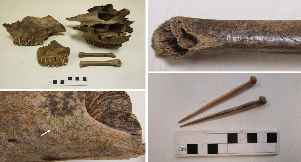 Other bones from the same pit included cattle skull fragments with knife marks indicating skinning. Very little of an animal carcass would have been wasted with the hides used for the production of leather while the bones provided raw material for the manufacture of a range of objects. At least nine Roman bone hairpins were recovered during the excavation although there is no evidence that they were being produced at the site.