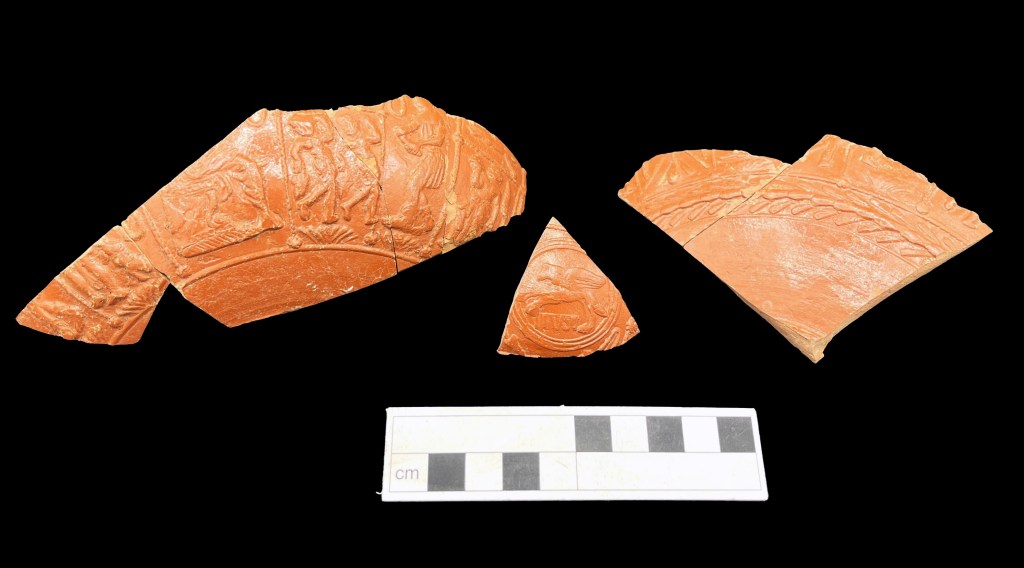 The assessment has revealed a wide range of pottery was being used in Roman Leicester, including imported samian fine wares. Samian was imported from Gaul (modern France) during the 1st and 2nd centuries up until the early part of the 3rd century, and provided Roman Britain with a range of bowls, dishes and cups for use as table wares. Most of the samian ware from the Cathedral dates to the 2nd century, including these decorated bowls and plain ware cup. The central medallion with the gryphon compares to the work of a known potter Cinnamus, and dates to c.AD 140-160.