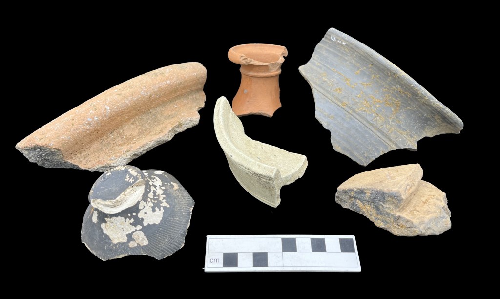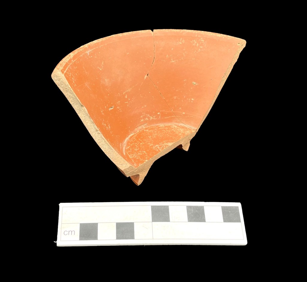 The orange flagon rim in the image is an oxidised ware flagon from the Much Hadham potteries in Hertfordshire, dating to the 3rd or 4th century, whilst the colour-coated ware beaker base is from the Nene Valley and dates to the late 2nd or 3rd century.