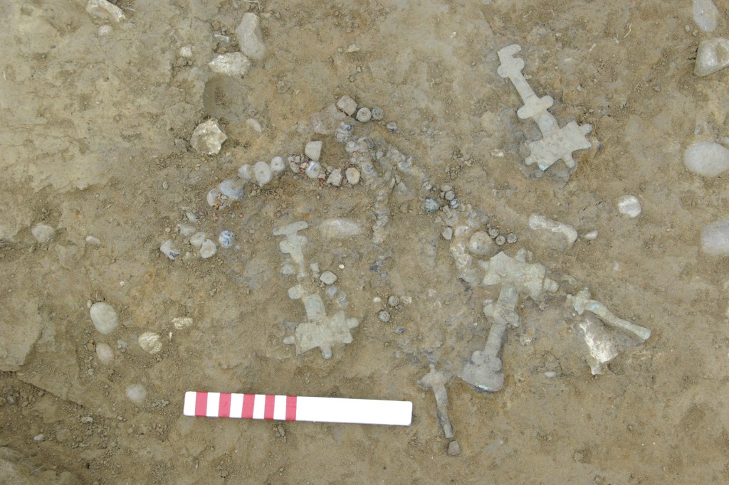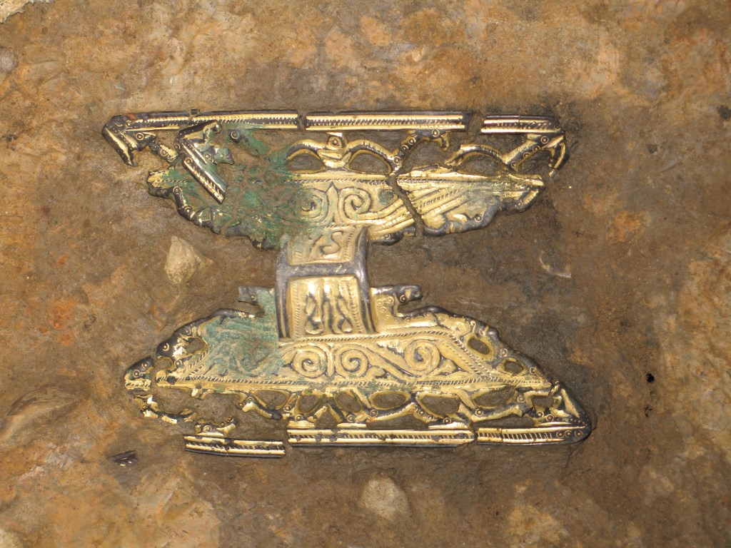 In 2010, Time Team returned to Leicestershire twice to investigate two very different sites for Series 18 of the programme. The first (Season 18, Episode 2 Saxons Death, Saxon Gold) revisited south Leicestershire and its Anglo-Saxon remains, to look more closely at another discovery by the Leicestershire Fieldworkers, this time a possible burial ground indicated by pottery and metalwork disturbed by ploughing. The excavations proved that an area of Saxon burials existed on the hilltop near West Langton, coinciding precisely with the fieldwalking scatter, and produced some spectacular jewellery including a lovely gilt equal armed brooch and a cluster of five brooches and associated bead necklaces which would otherwise have been lost to ploughing.