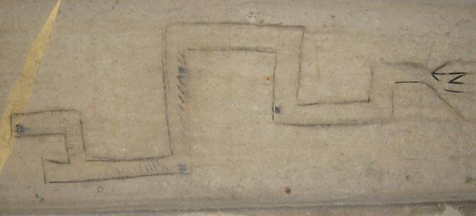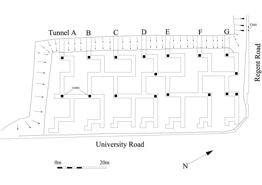 In the Wyggeston Girls shelter, wall markings were evident, with a system of crudely painted yellow lines with numbers and letters identifying each segment of tunnel. Pencil-drawn maps appeared on the walls in various places, with one appearing to show a complete length of tunnel with annotations suggesting the location of ventilator shafts and, possibly, benches.