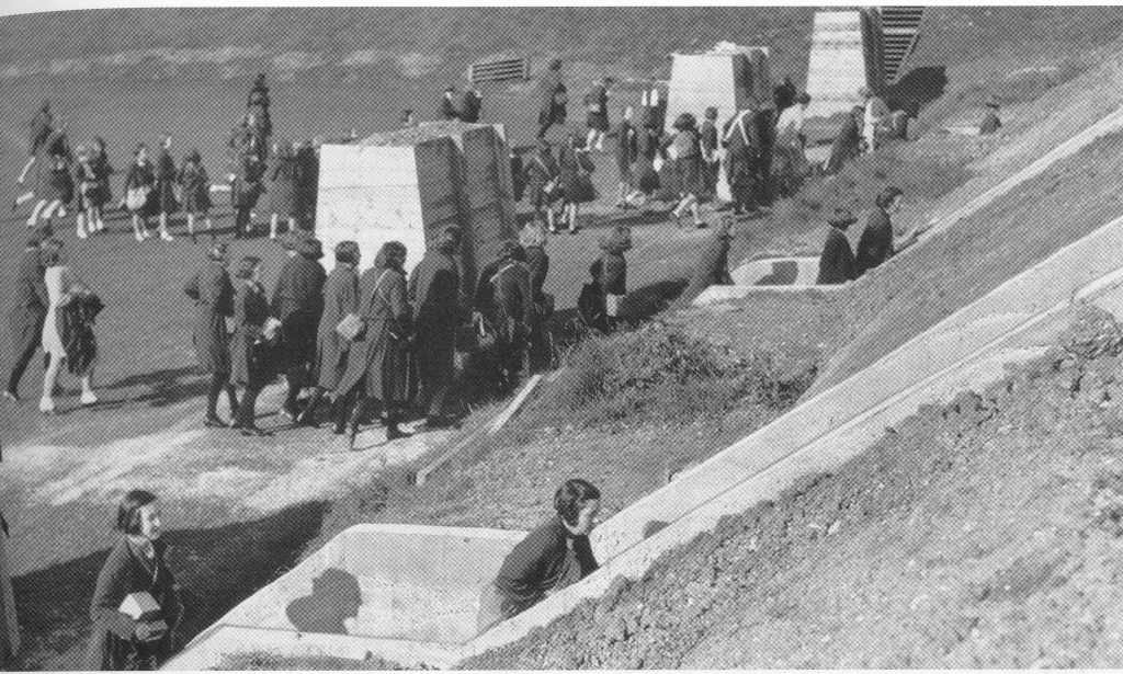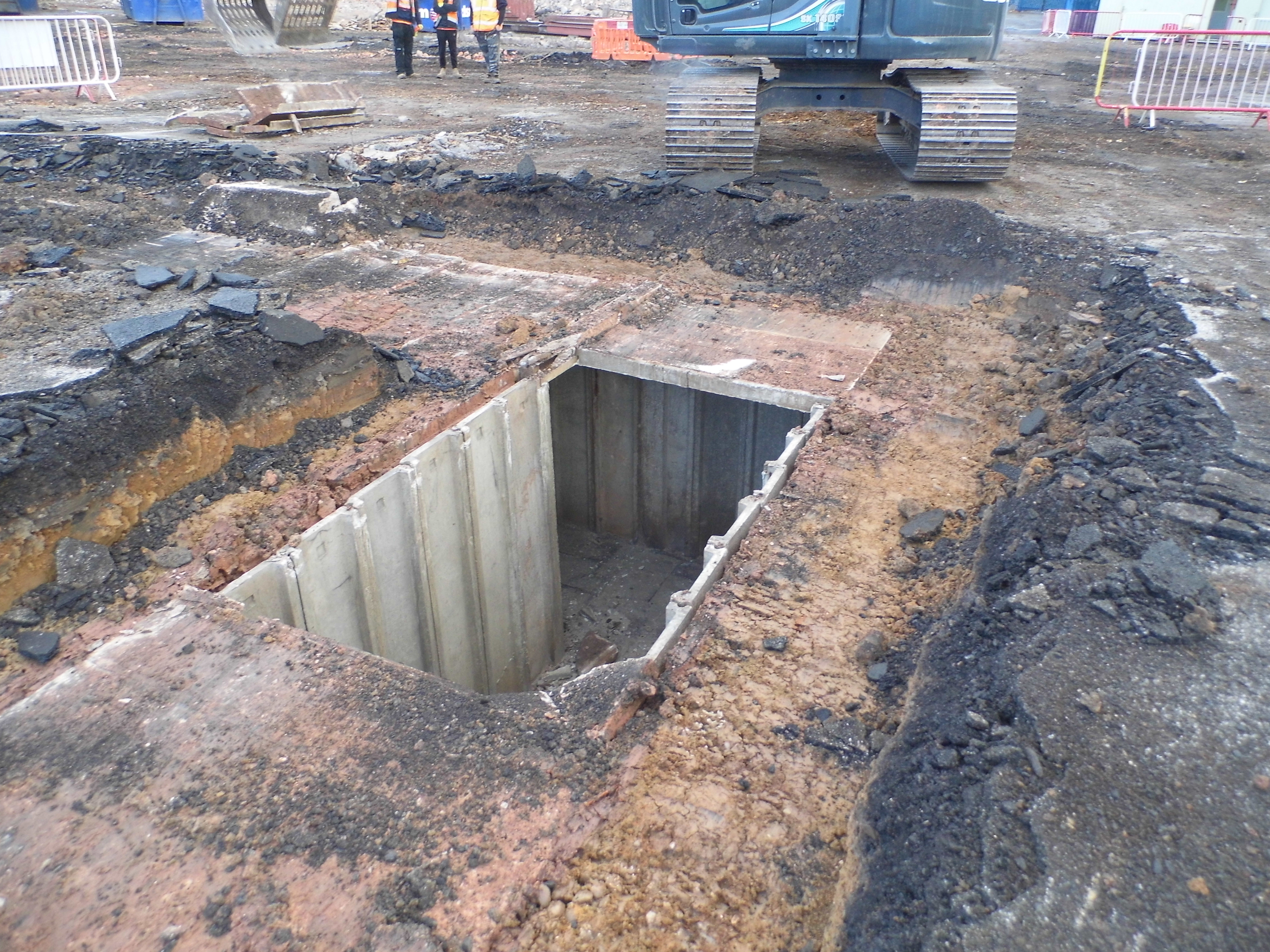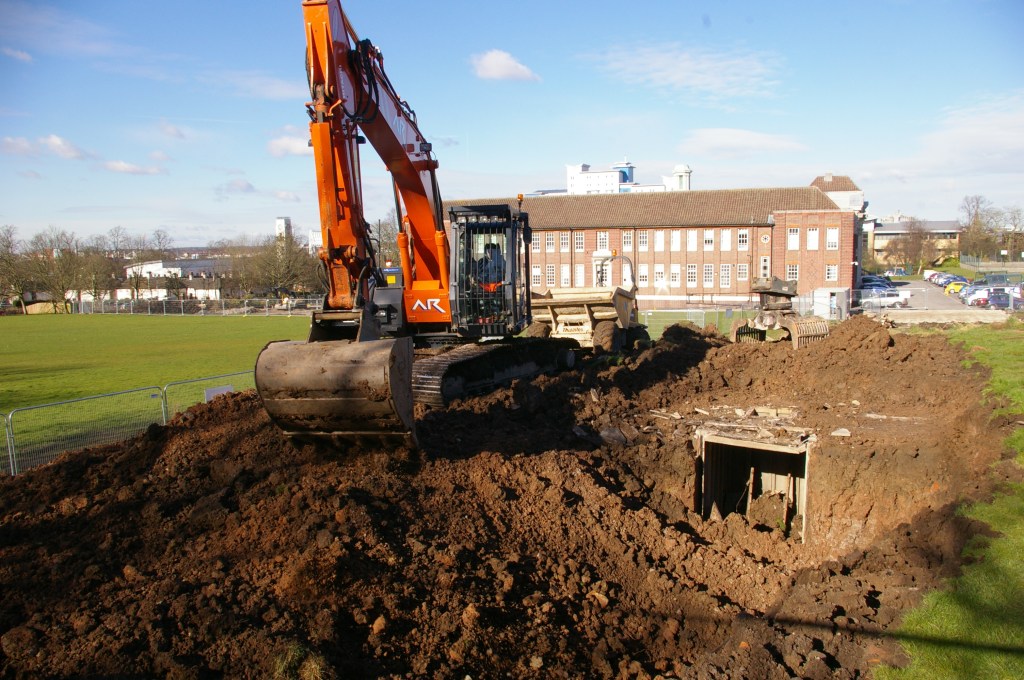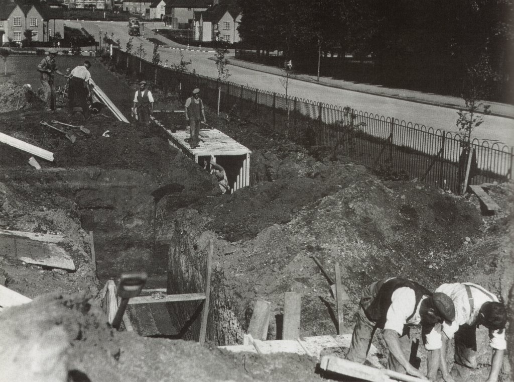 These were all constructed in a similar manner, using a cut and cover method and a pre-fabricated modular design. Five-foot wide trenches (1.5m) were hand or machine-dug and then lined with pre-cast concrete panels slotted together using a simple tongue and groove system and sometimes sealed with tar. Concrete spacers, set at regular intervals along the floor and the pre-cast concrete roof prevented the wall panels slumping inwards, and earth was replaced on top.