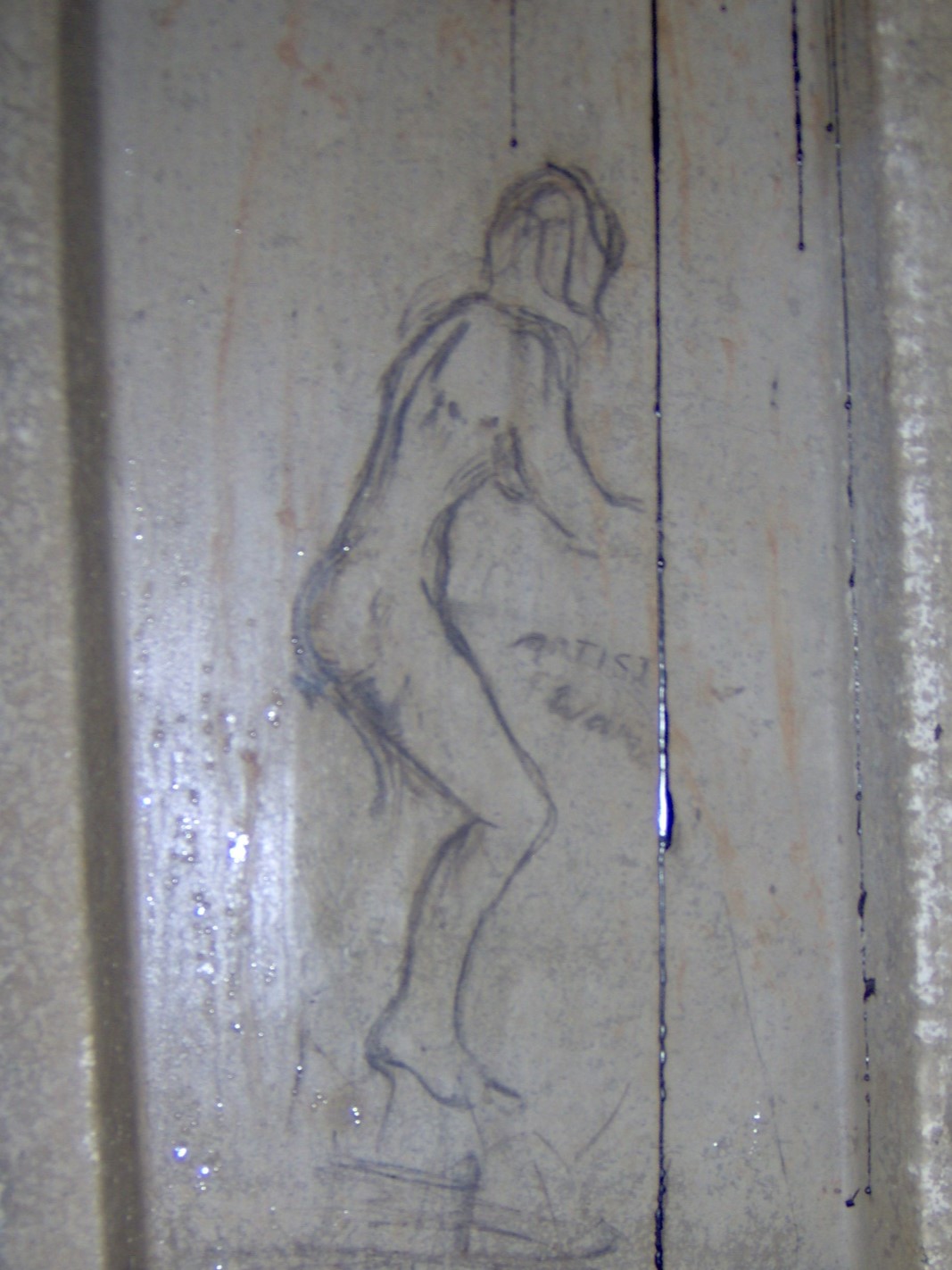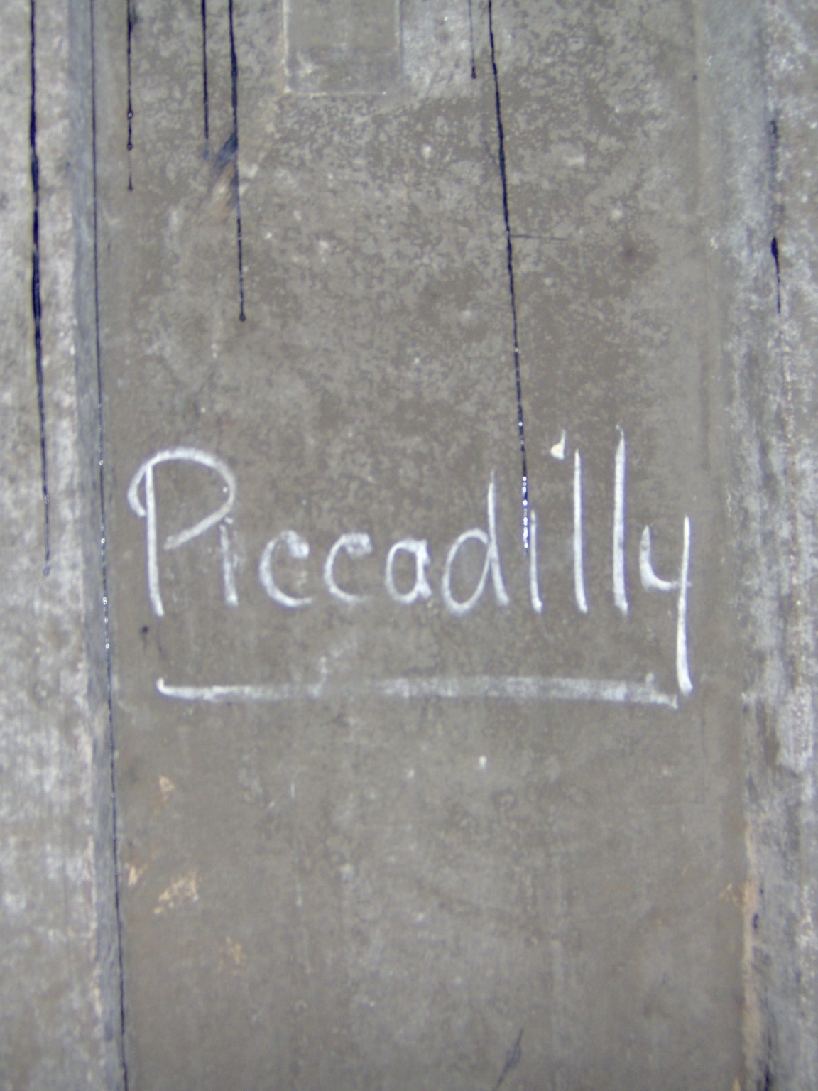 In Braunstone Park, another air raid shelter, explored in 2011, had corridors named after London streets, including Piccadilly (below), Marble Arch and The Strand; and a reminder to ‘Mind the g[h]ost] in Dead End Street!’ There was also some reasonably accomplished figurative art depicting naked women, some with hairstyles suggesting that these may date to the 1940s. Braunstone Hall was in use as a school during the Second World War and the shelter was presumably built for the pupils and staff. However, the American 82nd Airborne Division headquarters was also in the park and it is possible some of the artwork was created by American GIs.